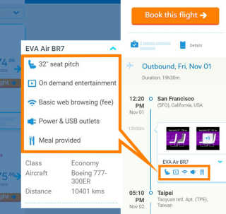 Likewise, you can check if there is an in-flight entertainment system, an outlet or USB connection and if in-flight meals would be catered during your flight.